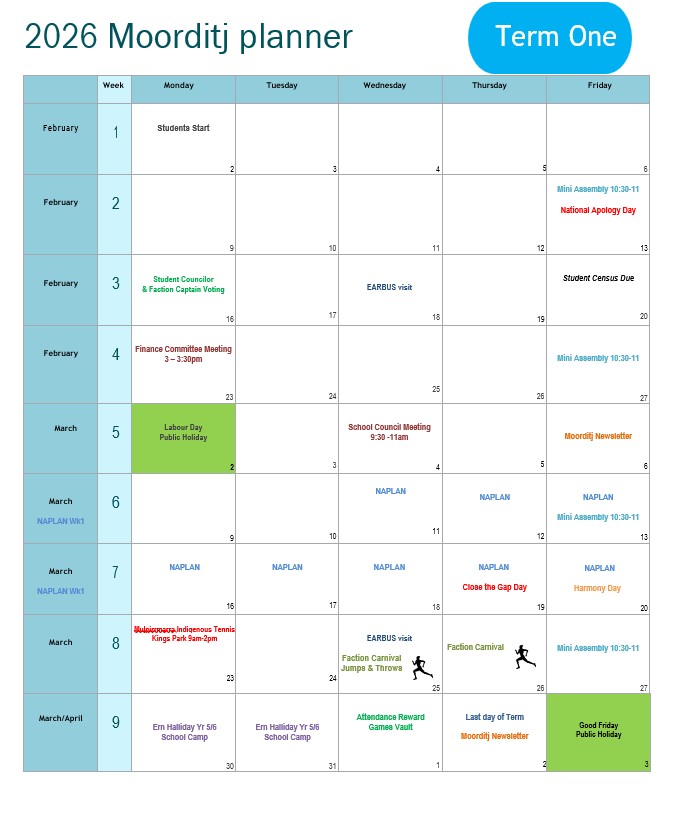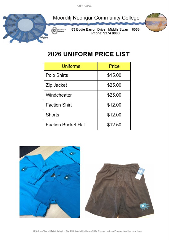Keep up to date with what's happening at Moorditj Noongar Community College. Below you will find the latest term calendar, newsletters, uniform lists and school hours 2026 Moorditj PlannerSchool Uniform Prices